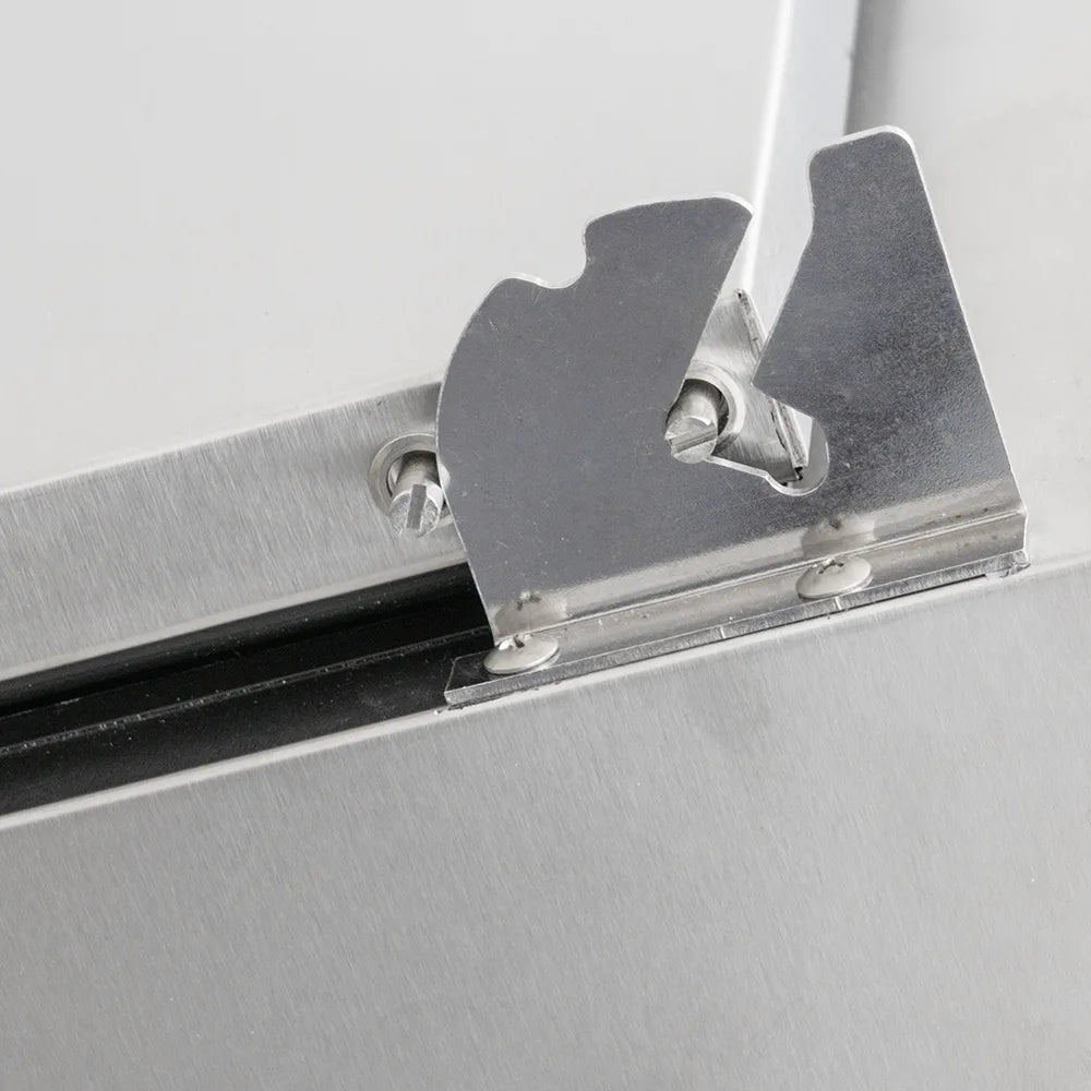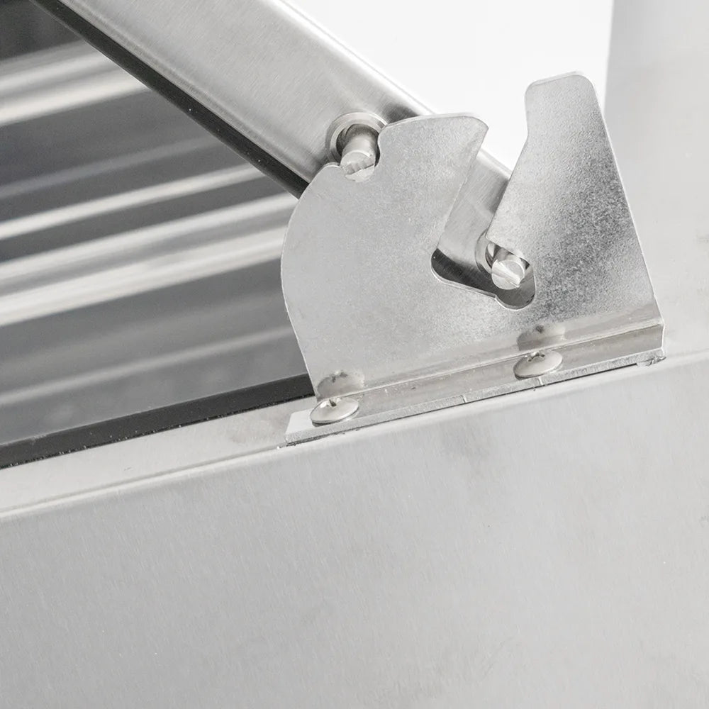 Diseñado para una larga durabilidad y rendimiento, el exterior es de acero inoxidable , incluyendo la parte superior, el frente y los extremos , mientras que la parte trasera de acero revestida con GalFan ofrece resistencia a la corrosión. En el interior, el revestimiento de aluminio con revestimiento transparente y el piso de acero inoxidable con esquinas redondeadas facilitan y agilizan la limpieza. Una sola puerta sólida da acceso al gabinete, que incluye dos estantes ajustables de alambre revestidos de PVC , ideales para almacenar productos a granel como salsas, recipientes y utensilios de preparación.
